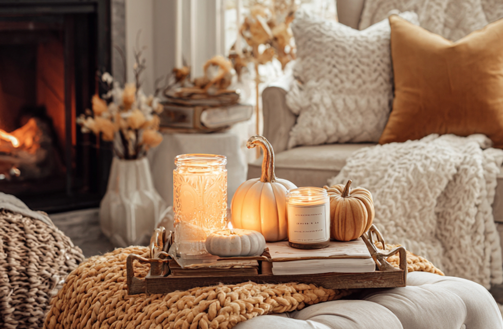 Lighting plays a huge role in setting the mood for fall. Trade bright overhead lights for soft, warm lighting — think lanterns, string lights, or candles in amber or copper tones. The flicker of candlelight instantly adds that cozy, inviting atmosphere perfect for chilly evenings.